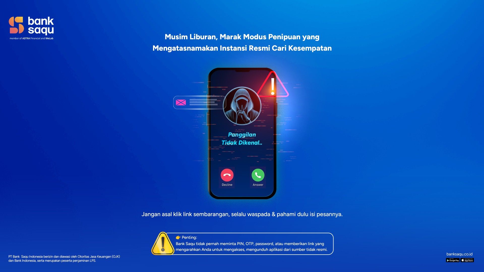 Kampanye “Serangan Hantu Cyber” ini menegaskan peran Bank Saqu sebagai mitra finansial yang tidak hanya menyediakan layanan perbankan digital, tetapi juga melindungi keamanan penggunanya. Karena di dunia digital, yang paling kuat bukan yang paling cepat, melainkan yang paling waspada.